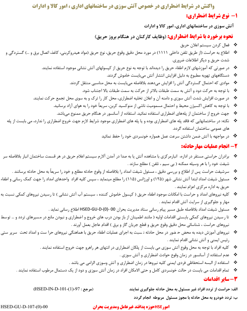 HSED-GU-D-107-(0)-00 واكنش در شرايط اضطراري در خصوص آتش سوزی در ساختمانهای اداری، امور کالا و اداراتدریافت